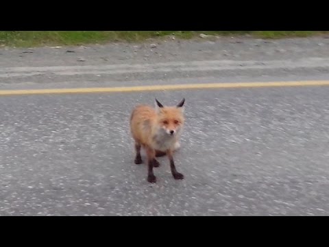 Дикий лисенок вышел на дорогу за едой